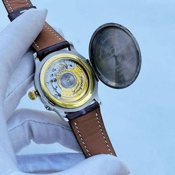 ✅ Nắp lưng double caseback khắc tên Charles A. Lindbergh, có thể mở ra ngắm bộ máy cơ tinh xảo bên trong