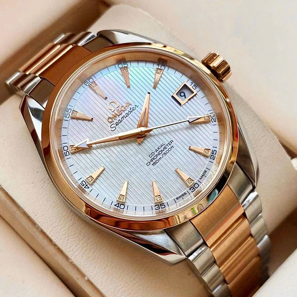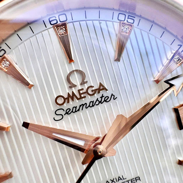✅ Omega Seamaster AquaTerra 150m dial mặt xà cừ mốp vân nổi, toàn bộ kim cọc logo được làm bằng vàng hồng 18k, các cọc số đính 11 viên kim cương cao cấp.